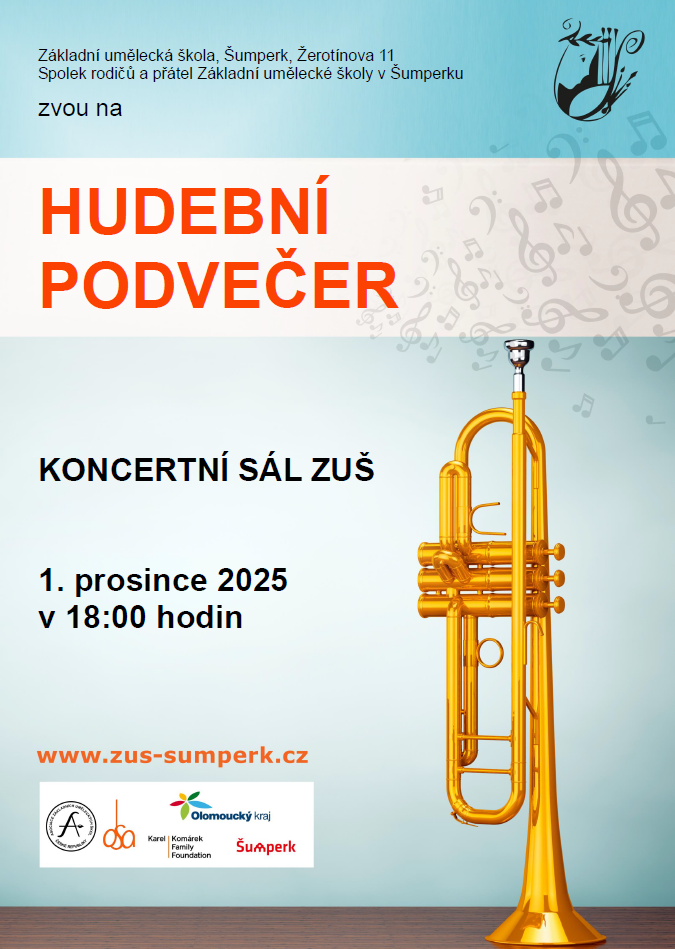 Hudební podvečerV pondělí 1. prosince se od 18:00 představí naši žáci na hudebním podvečeru, který se bude konat v koncertním sále ZUŠ. Srdečně všechny zveme.