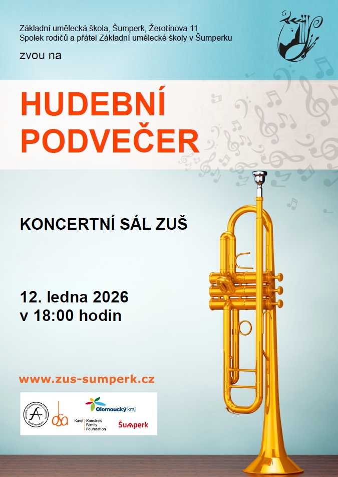 Hudební podvečerV pondělí 12. ledna se od 18:00 v koncertním sále ZUŠ Šumperk uskuteční další ze série hudebních podvečerů. Na tento koncert srdečně zveme.