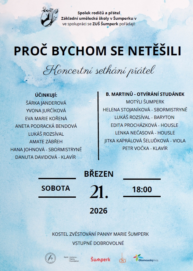 Srdečně vás zveme na koncertní setkání „Proč bychom se netěšili“. Přijďte si užít příjemný večer plný hudby v podání účinkujících ze ZUŠ Šumperk a hostů. Koncert se uskuteční v sobotu 21. března 2026 v 18:00 v Kostele Zvěstování Panny Marie v Šumperku. Těšíme se na vás!