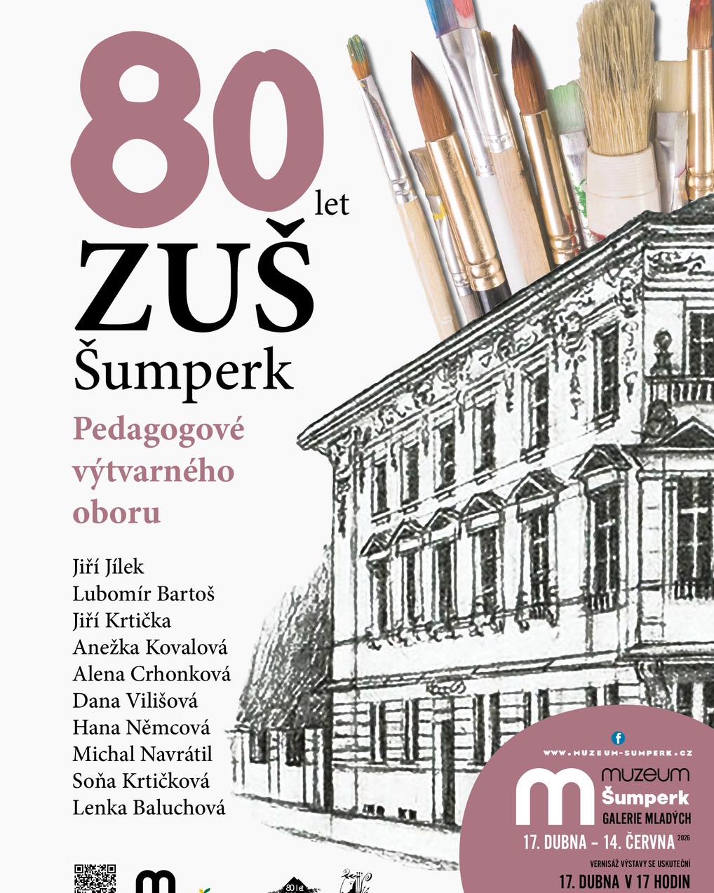 Zveme vás na vernisáž výstavy 80 let ZUŠ Šumperk: pedagogové výtvarného oboru, která se koná 17. dubna od 17 hodin v Muzeum Šumperk. Přijďte se podívat na tvorbu pedagogů, kteří stojí za generacemi mladých umělců, a oslavit významné jubileum naší instituce.
