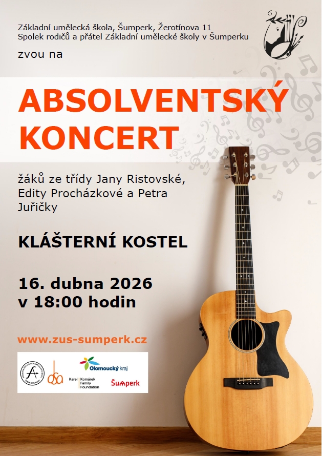 VI. Absolventský koncertVe čtvrtek 16. dubna proběhne od 18:00 v kapli klášterního kostela absolventský koncert, na kterém se představí žáci ze tříd Jany Ristovské, Edity Procházkové a Petra Juřičky. Srdečně všechny zveme.
