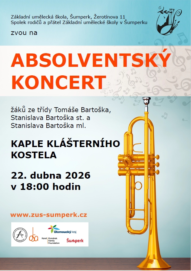 VII. Absolventský koncertDalší absolventský koncert v klášterním kostele se uskuteční ve středu 22. dubna od 18:00. Tentokrát se představí žáci ze tříd Tomáše Bartoška, Stanislava Bartoška st. a Stanislava Bartoška ml. Srdečně všechny zveme.